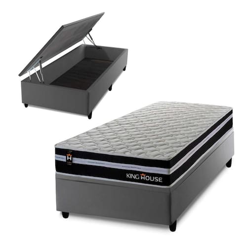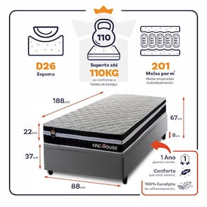 - Altura: 22 cm (colchão) + 37 cm (box baú) + 8 cm (pés) = 67 cm de altura;