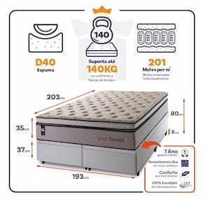 - Altura: 35 cm (colchão) + 37 cm (box baú) + 8 cm (pés) = 80 cm de altura;
