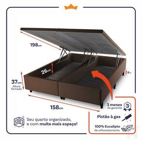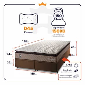 - Altura: 24 cm (colchão) + 37 cm (box baú) + 8 cm (pés) = 69 cm de altura;