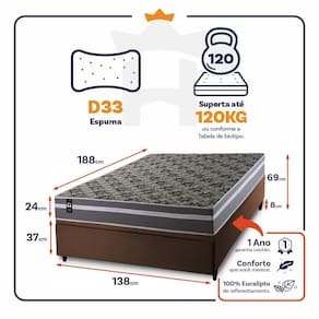 - Altura: 24 cm (colchão) + 37 cm (box baú) + 8 cm (pés) = 69 cm de altura;