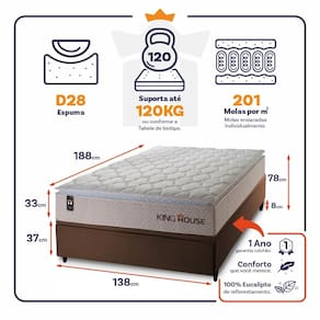 O Colchão Roma é feito com os mais nobres materiais em sua composição, ele conta com espuma D28 e molas ensacadas. Por ser mais macio, o colchão de molas ensacadas individualmente traz benefícios e ajuda no alinhamento da coluna. O colchão King House acomoda melhor o contorno do corpo, dispondo de forma correta quadris e ombros, expulsando as dores e problemas de coluna.