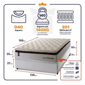 O Colchão New York é feito com os mais nobres materiais em sua composição, ele conta com espuma D40 e molas ensacadas. Por ser mais macio, o colchão de molas ensacadas individualmente traz benefícios e ajuda no alinhamento da coluna. O colchão King House acomoda melhor o contorno do corpo, dispondo de forma correta quadris e ombros, expulsando as dores e problemas de coluna.