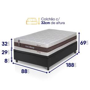 - Altura: 69 cm (colchão) + 8 cm (box) = 77 cm de altura;