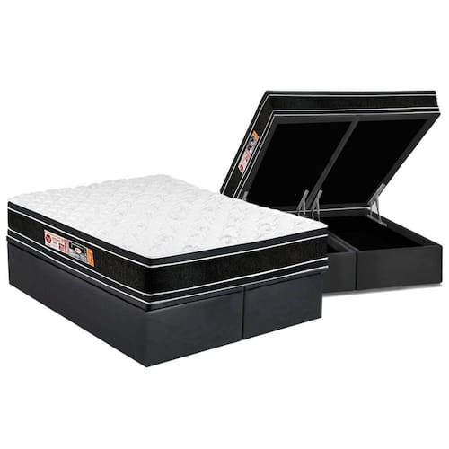 Abaixo segue os produtos do KIT: Conjunto Box Baú Queen: Colchão Espuma Castor D33 Black e White Air Double Face Euro Pillow + Base CRC Suede Gray(158x198)