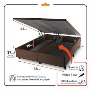 - Altura: 19 cm (colchão) + 37 cm (box baú) + 8 cm (pés) = 64 cm de altura;