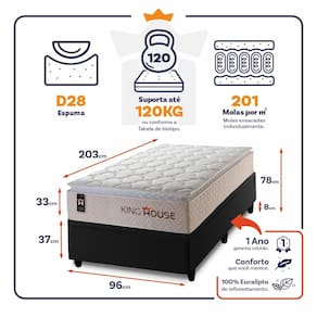 O Colchão Roma é feito com os mais nobres materiais em sua composição, ele conta com espuma D28 e molas ensacadas. Por ser mais macio, o colchão de molas ensacadas individualmente traz benefícios e ajuda no alinhamento da coluna. O colchão King House acomoda melhor o contorno do corpo, dispondo de forma correta quadris e ombros, expulsando as dores e problemas de coluna.