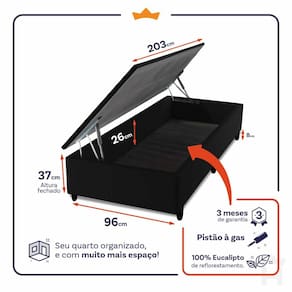- Altura: 33 cm (colchão) + 37 cm (box baú) + 8 cm (pés) = 78 cm de altura;