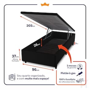 - Altura: 29 cm (colchão) + 37 cm (box baú) + 8 cm (pés) = 74 cm de altura;