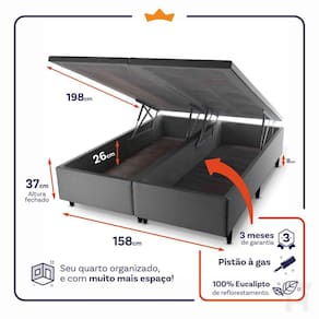 - Altura: 29 cm (colchão) + 37 cm (box baú) + 8 cm (pés) = 74 cm de altura;