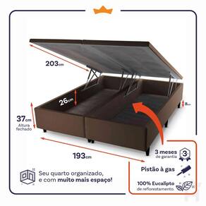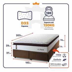 - Altura: 29 cm (colchão) + 37 cm (box baú) + 8 cm (pés) = 74 cm de altura;