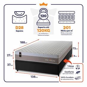 - Altura: 27 cm (colchão) + 37 cm (box baú) + 8 cm (pés) = 72 cm de altura;
