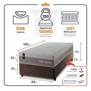 O Colchão Sheffield é feito com os mais nobres materiais em sua composição, ele conta com espuma D28 e molas ensacadas. Por ser mais macio, o colchão de molas ensacadas individualmente traz benefícios e ajuda no alinhamento da coluna. O colchão King House acomoda melhor o contorno do corpo, dispondo de forma correta quadris e ombros, expulsando as dores e problemas de coluna.