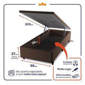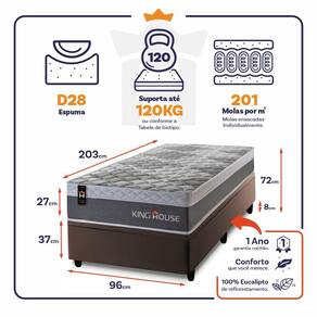 - Altura: 27 cm (colchão) + 37 cm (box baú) + 8 cm (pés) = 72 cm de altura;