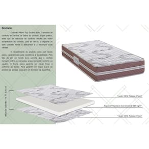 Dimensões(Cm): Comprimento(Profundidade): 188cm x Largura: 88cm x Altura: 26cm Tipo de Colchão - Espuma Tipo de Pillow - Pillow Top Americano Tecido com Tratamento do Colchão - AntiÁcaro e AntiFungo Bordado do Revestimento do Colchão - Contínuo Forração Revestimento do Colchão - Poliéster Tecido de Revestimento da Faixa Lateral do Colchão - Poliéster Modo de Utilização do Colchão - Double Side Camadas Interna do Estofamento de Espuma do Colchão - Alta Qualidade Tipo de Estrutura do Bloco de Espuma do Colchão - Poliuretano Tipo de Espuma do Colchão - Espuma de Poliuretano de Alta Qualidade Densidade da Espuma do Colchão - D33 Nível de Firmeza do Colchão - Firme Peso Máximo Suportado do Colchão - 110 kg Certificação de Qualidade do Colchão - Qualidade Aprovada - INMETRO - Qualidade Costa Rica - ISO 9001 - Selo Abicol Nossa Avaliação do Colchão - Qualidade Boa Tempo de Garantia do Colchão - 3 meses