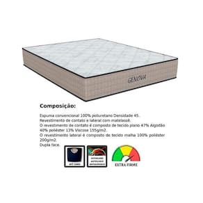 Dimensões(Cm): Comprimento(Profundidade): 188cm x Largura: 88cm x Altura: 20cm Tecido com Tratamento - AntiÁcaro e AntiFungo Tipo de Bordado do Tecido de Revestimento - Matelassê Tipo Tecido de Forração Revestimento - Jacquard/Malha Tipo de Forração do Revestimento Inferior - Antiderrapante Tipo de Tecido de Revestimento da Faixa Lateral - Suede Modo de Utilização - One Side Densidade da Espuma - D45 Nível de Firmeza do Colchão - Extra Firme Peso Máximo Suportado - 120 kg Certificados de Qualidade - Qualidade Aprovada Nossa Avaliação - Qualidade Excelente Tempo de Garantia - 12 meses
