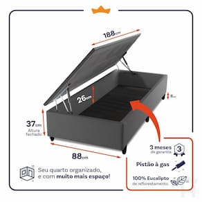 - Altura: 19 cm (colchão) + 37 cm (box baú) + 8 cm (pés) = 64 cm de altura;