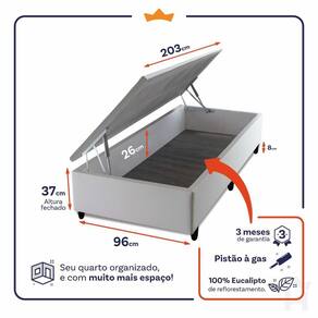 - Altura: 19 cm (colchão) + 37 cm (box baú) + 8 cm (pés) = 64 cm de altura;