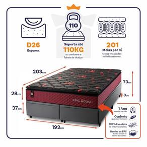 - Altura: 28 cm (colchão) + 37 cm (box baú) + 8 cm (pés) = 73 cm de altura;