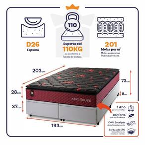 - Altura: 28 cm (colchão) + 37 cm (box baú) + 8 cm (pés) = 73 cm de altura;