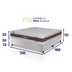 - Altura: 58 cm (colchão) + 12 cm (box) = 70 cm de altura;