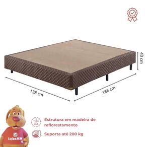 Base Box Casal Ecoflex 138x188x40 Marca: Ecoflex Estrutura: Madeira de reflorestamento Revestimento: Tecido resistente Tipo: Base Box Casal Sistema de sustentacao: Pes fixos de alta resistencia Acabamento: Antiderrapante na superficie Capacidade de suporte: 200kg Compatibilidade: Colchoes casal 138x188 Altura da Base: 25cm