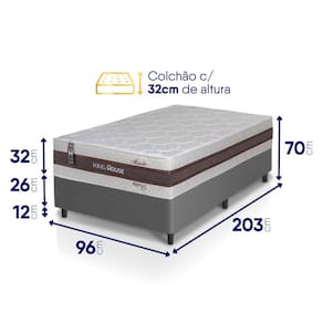 - Altura: 58 cm (colchão) + 12 cm (box) = 70 cm de altura;