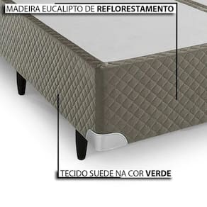 - Base com estrutura em madeira Eucalipto de reflorestamento, parte superior com com chapa Compensada Multilaminada, revestimento em tecido Suede bordado com espumas de alta performance, que proporcionam um toque suave e com tratamento anti alérgico, anti fungo e anti mofo.