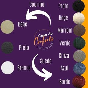 Em suede, azul, bege, bordo, cinza, marrom ou preto.