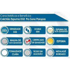 Dimensões(Cm): Comnto(Profundidade): 203cm x Largura: 193cm x Altura: 26cm Tipo de Colchão - Espuma Vantagens Extras de Colchão - EPS Bordado do Revestimento do Colchão - Matelassê Forração Revestimento do Colchão - Malha de Alta Qualidade - Algodão Tecido de Revestimento da Faixa Lateral do Colchão - Malha Modo de Utilização do Colchão - Double Side Tipo de Espuma do Colchão - Espuma de Poliuretano de Alta Qualidade Densidade da Espuma do Colchão - D33 Nível de Firmeza do Colchão - Firme - Extra Firme Peso Máximo Suportado do Colchão - 110 kg Certificação de Qualidade do Colchão - Qualidade Aprovada - INMETRO Nossa Avaliação do Colchão - Qualidade Boa Tempo de Garantia do Colchão - 12 meses