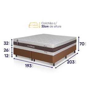 - Altura: 58 cm (colchão) + 12 cm (box) = 70 cm de altura;
