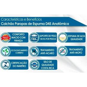 Dimensões(Cm): Comnto(Profundidade): 198cm x Largura: 158cm x Altura: 25cm Vantagens Extras de Colchão - Ecologicamente Correto Tipo de Pillow - Pillow Top Europeu Tecido com Tratamento do Colchão - AntiÁcaro e AntiFungo Bordado do Revestimento do Colchão - Matelassê Forração Revestimento do Colchão - Poliéster Forração do Revestimento Inferior do Colchão - Antiderrapante Modo de Utilização do Colchão - One Side Camadas Interna do Estofamento de Espuma do Colchão - Alta Qualidade Tipo de Estrutura do Bloco de Espuma do Colchão - EPS Tipo de Espuma do Colchão - Espuma de Poliuretano Aerada Densidade da Espuma do Colchão - D45 Tipo de Mola do Colchão - Nível de Firmeza do Colchão - Macio c/ Firmeza Peso Máximo Suportado do Colchão - 150 kg Certificação de Qualidade do Colchão - Qualidade Aprovada - INMETRO - Qualidade Costa Rica Nossa Avaliação do Colchão - Qualidade Muito Boa Tempo de Garantia do Colchão - 12 meses
