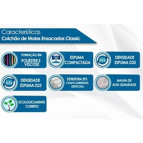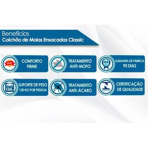 Dimensões(Cm): Comprimento(Profundidade): 198cm x Largura: 158cm x Altura: 26cm Vantagens Extras de Colchão - Ecologicamente Correto - c/ Sistema Polyframe - Manta Acrílica Tecido com Tratamento - AntiÁcaro e AntiFungo Tipo de Bordado do Tecido de Revestimento - Contínuo Tipo Tecido de Forração Revestimento - Malha de Alta Qualidade Tipo de Forração do Revestimento Inferior - Antiderrapante Tipo de Tecido de Revestimento da Faixa Lateral - Poliéster Cor do Tecido de Revestimento da Faixa Lateral - Bege Cor do Tecido do Tampo - Branco Modo de Utilização - One Side Camadas Interna do Estofamento de Espuma - AG Tipo de Estrutura Ortopédico - EPS Tipo de Mola - Ensacadas MasterPocket Nível de Firmeza do Colchão - Firme Peso Máximo Suportado - 120 kg Certificados de Qualidade - Qualidade Aprovada Nossa Avaliação - Qualidade Muito Boa Tempo de Garantia - 12 meses Opções de Camas Box para usar com o seu ##nomesimples## - Cama Box Base Universal e Cama Box Baú Nobuck Café/Black/Cinza/Bege