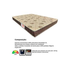 Dimensões(Cm): Comnto(Profundidade): 188cm x Largura: 78cm x Altura: 20cm Tecido com Tratamento do Colchão - AntiÁcaro e AntiFungo Bordado do Revestimento do Colchão - Contínuo - Matelassê Forração Revestimento do Colchão - Bordado de Alta Qualidade Tecido de Revestimento da Faixa Lateral do Colchão - Poliéster Modo de Utilização do Colchão - Double Side Camadas Interna do Estofamento de Espuma do Colchão - Alta Qualidade Densidade da Espuma do Colchão - D33 Nível de Firmeza do Colchão - Extra Firme Peso Máximo Suportado do Colchão - 120 kg Certificação de Qualidade do Colchão - Qualidade Aprovada - INMETRO Nossa Avaliação do Colchão - Qualidade Muito Boa Tempo de Garantia do Colchão - 12 meses