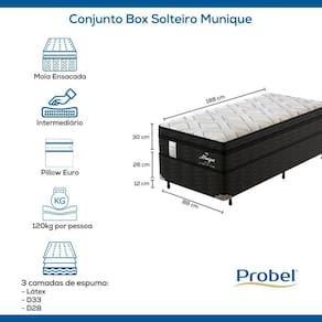 As espumas do Conjunto Box Solteiro Munique foram desenvolvidas com a Tecnologia ProMax Probel, que passam por rigorosos testes de qualidade em laboratório e recebem tratamento antiácaro e antifungo.