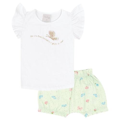 A previsão é de muitas brincadeiras e diversão, então este é o conjunto ideal para aproveitar o dia! As peças deste conjunto são fresquinhas e ideais para garantir todo conforto que sua princesa merece durante as brincadeiras, a blusa é confeccionada em cotton leve trabalhado na cor branco e possuí uma borboleta bordada em paetê no peito com escrita “Sou uma linda borboleta e gosto de voar”, já o short é confeccionado em cotton leve na cor pistache e possui estampas de borboletas e frutinhas. As peças podem ser usadas separadamente, aumentando ainda mais as composições de looks incríveis para sua pequena.