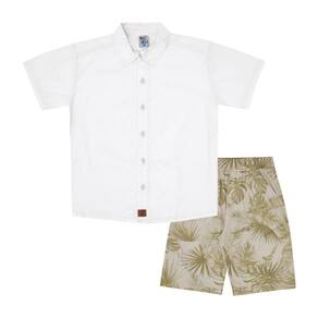 Não há quem resista a esta fofura, seu garotinho todo charmoso com nosso conjunto pequeno fashionista. A camisa confeccionada em tecido trioline na cor branco, possuí botões e um pequeno aplique na frente da camisa. O conjunto acompanha um short confeccionado em sarja na cor digital marinho e possuí estampa tropical de folhas e coqueiros refrescantes. Ideal para sair com os papais para um almoço à beira da praia, que tal?