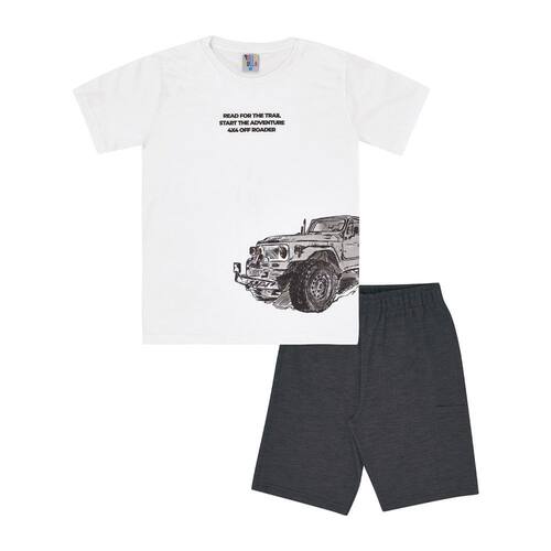 Conjunto Trilha é ideal para os meninos que gostam de conforto e estilo! Com a camiseta confeccionada em tecido meia malha na cor branca, ela possuí estampa frontal com jeep de trilha e escrita "Pronto para trilha comece a aventura 4x4 fora da estrada" e a bermuda de moletom na cor mescla preta.