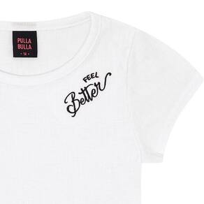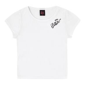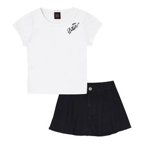 As meninas prontas para encontrar com a amiga e tomar um açaí! O conjunto possuí duas peças, sendo elas a blusa confeccioanda em malha canelada na cor branca, possuí também bordado frontal próximo ao ombro com escrita "Sinta-se melhor" e o short saia em tecido sarja na cor preta. Ambas as peças podem ser usadas separadamente, podendo aumentar as chances na composição de looks.