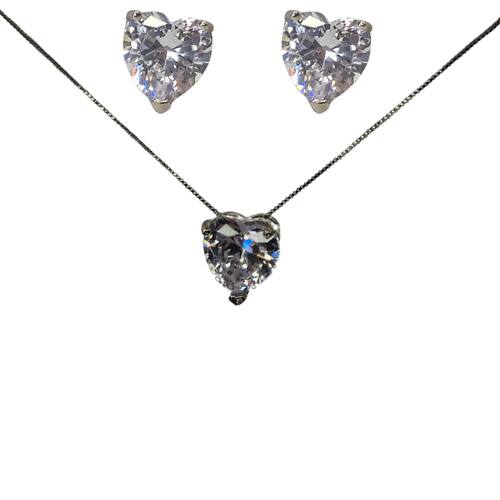 Conjunto Brinco e Colar Coração Cristal Aquamarine - Cor: Prata Pedra Transparente