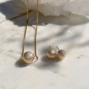 Conjunto composto de um colar, na corrente veneziana, com pingente fixo de esfera e um par de brincos.
