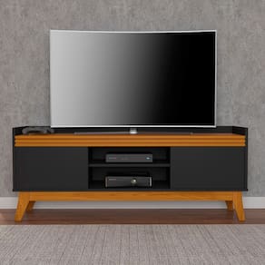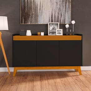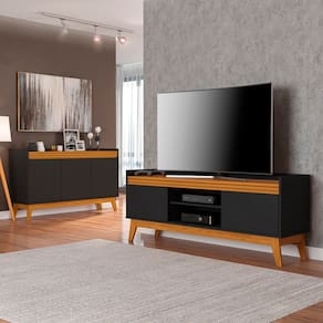 Nosso conjunto é composto pelo rack Astúrias que comporta uma TV de até 50 polegadas, fabricado em MDP/MDF, uma prateleira ideal para eletrônicos e objetos de decoração, com ripado frontal, portas articuladas, pés retro em MDF e pintura UV e um lindo Buffet com estrutura em MDP, portas articuladas, prateleiras internas, tampo superior com acabamento ripado, portas em MDF e pintura UV.