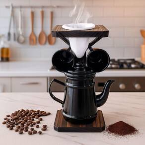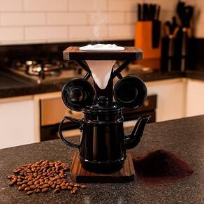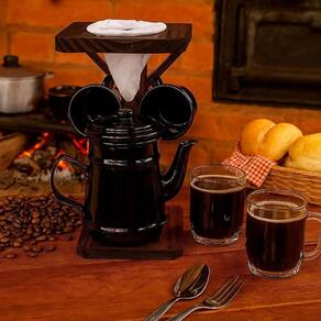 Conjunto café com bule de alumínio e suporte rústico - black Conjunto para café artesanal - suporte em madeira com coador de pano, bule em alumínio e 2 canecas em acrílico Transforme seu cantinho do café em um espaço cheio de charme e aconchego, trazendo para sua casa o charme de uma cafeteria. Este conjunto artesanal reúne um suporte em madeira rústica, cafeteira em alumínio com design retrô, coador de pano removível e duas canecas em acrílico, unindo funcionalidade e estilo para momentos únicos. Perfeito para decorar sua cozinha, varanda ou sacada, é o convite ideal para celebrar pausas gostosas - seja o coffee break relaxante, o café da manhã em família ou aquela tarde com amigos. Cada peça foi pensada para trazer conforto e uma experiência acolhedora. Presenteie-se ou surpreenda quem você gosta com um item que combina tradição, qualidade e afeto. Porque café não é só bebida, é momento para compartilhar, celebrar e apreciar com estilo e carinho. Dimensões aproximadas: - suporte coador de café em madeira: altura: 22 cm x largura: 12 cm x comprimento: 12 cm - bule de café em alumínio de 450 ml: altura: 11 cm x largura: 7 cm x comprimento: 7 cm Características do produto: - suporte artesanal em madeira com acabamento rústico decorativo, coador de pano removível para café, bule em alumínio e duas canecas em acrílico. Um conjunto funcional, feito com cuidado e bom gosto para valorizar e organizar seu cantinho do café. Cuidados e sugestões: - limpe o suporte de madeira com pano seco ou levemente umedecido. Lave o coador de pano apenas com água e deixe secar bem. Use o lado amarelo da esponja para limpar o bule de alumínio e as canecas acrílicas, evitando riscos. Guarde em local arejado e seco. do produto: - o produto é cuidadosamente embalado para evitar danos durante o transporte. Caso ocorra algum problema, oferecemos um sistema de e troca para sua tranquilidade. Imagens meramente ilustrativas - produto artesanal, podendo variar de cor e/ou tonalidade Marca: Não Informado
