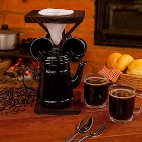 Conjunto café com bule de alumínio e suporte rústico - black Conjunto para café artesanal - suporte em madeira com coador de pano, bule em alumínio e 2 canecas em acrílico Transforme seu cantinho do café em um espaço cheio de charme e aconchego, trazendo para sua casa o charme de uma cafeteria. Este conjunto artesanal reúne um suporte em madeira rústica, cafeteira em alumínio com design retrô, coador de pano removível e duas canecas em acrílico, unindo funcionalidade e estilo para momentos únicos. Perfeito para decorar sua cozinha, varanda ou sacada, é o convite ideal para celebrar pausas gostosas - seja o coffee break relaxante, o café da manhã em família ou aquela tarde com amigos. Cada peça foi pensada para trazer conforto e uma experiência acolhedora. Presenteie-se ou surpreenda quem você gosta com um item que combina tradição, qualidade e afeto. Porque café não é só bebida, é momento para compartilhar, celebrar e apreciar com estilo e carinho. Dimensões aproximadas: - suporte coador de café em madeira: altura: 22 cm x largura: 12 cm x comprimento: 12 cm - bule de café em alumínio de 450 ml: altura: 11 cm x largura: 7 cm x comprimento: 7 cm Características do produto: - suporte artesanal em madeira com acabamento rústico decorativo, coador de pano removível para café, bule em alumínio e duas canecas em acrílico. Um conjunto funcional, feito com cuidado e bom gosto para valorizar e organizar seu cantinho do café. Cuidados e sugestões: - limpe o suporte de madeira com pano seco ou levemente umedecido. Lave o coador de pano apenas com água e deixe secar bem. Use o lado amarelo da esponja para limpar o bule de alumínio e as canecas acrílicas, evitando riscos. Guarde em local arejado e seco. do produto: - o produto é cuidadosamente embalado para evitar danos durante o transporte. Caso ocorra algum problema, oferecemos um sistema de e troca para sua tranquilidade. Imagens meramente ilustrativas - produto artesanal, podendo variar de cor e/ou tonalidade Marca: Não Informado Ean: 7892484215147