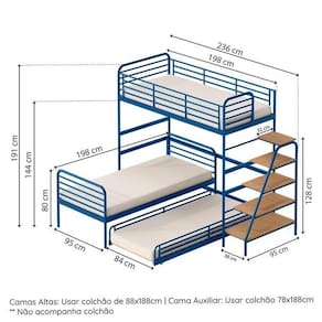Largura do Conjunto: 236 cm Linha ou Coleção: Teko Marca: Casatema Material do Estrado: MDF Material Principal: Aço Necessita Montagem: Sim Origem do Produto: Nacional Possui Baú: Não Possui Portas: Não Recomendações de Uso, Manutenção e Limpeza: Use um pano macio, levemente umedecido com água. Não utilize solventes ou abrasivos.Para garantir estabilidade e durabilidade, é recomendado reapertar os parafusos de tempos em tempos. Rodízio com Trava: Não Sistema de Montagem: Parafusos Suporta Até (kg): 80 kg Tamanho do Colchão Indicado Cama Auxiliar: 78x188 Tipo de Estrado: Fixo