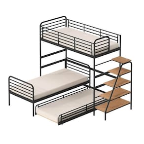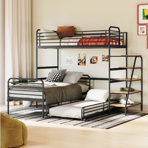 A cama superior é acessada por uma escada lateral multifuncional, que também funciona como estante, otimizando o ambiente com personalidade. Na parte inferior, o conjunto inclui uma cama padrão com cabeceiras arredondadas e uma cama auxiliar com rodízios de plástico que garante mobilidade suave e prática para acomodar até três pessoas com conforto.