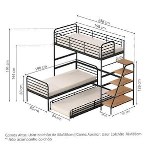 Largura do Conjunto: 236 cm Linha ou Coleção: Teko Marca: Casatema Material do Estrado: MDF Material Principal: Aço Necessita Montagem: Sim Origem do Produto: Nacional Possui Baú: Não Possui Portas: Não Recomendações de Uso, Manutenção e Limpeza: Use um pano macio, levemente umedecido com água. Não utilize solventes ou abrasivos.Para garantir estabilidade e durabilidade, é recomendado reapertar os parafusos de tempos em tempos. Rodízio com Trava: Não Sistema de Montagem: Parafusos Tamanho do Colchão Indicado Cama Auxiliar: 78x188 Tipo de Estrado: Fixo