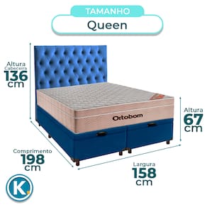 Conjunto Queen Colchão Airtech + Cama Box BauColchão Ortobom Queen com 25cm de altura, ideal para conforto no uso diárioTecido em poliéster que garante toque suave e boa ventilaçãoSuporte de até 120kg, ideal para diferentes biotipos com firmeza balanceadaBase baú Queen com 42cm de altura e amplo espaço interno para organizaçãoRevestimento em Veludo , fácil de limpar e com visual modernoEstrutura reforçada com capacidade para até 150KgFicha Técnica Colchão:Modelo: AirtechMarca: OrtobomTamanho: QueenTecido: PoliésterLargura: 158cmComprimento: 198cmAltura: 25cmSuporte de Peso: 120KgGarantia: 3 MesesFicha Técnica Cama Box Bau:Modelo: EliteMarca: NatureTamanho: QueenTecido: VeludoLargura: 158cmComprimento: 198cmAltura: 35cmAltura dos Pés: 7cmMaterial dos Pés: MadeiraSuporte de Peso: 150KgPeso: 40KgGarantia: 3 MesesAtenção:Antes da compra certifique-se de que o produto passa por elevadores, portas e corredores.As transportadoras não realizam entregas por escadas ou içamentos.Caso o item não caiba no elevador, a entrega será considerada concluída no térreo do prédio.A cor e tonalidade do produto pode variar de acordo com o dispositivo que o usuário está acessando.