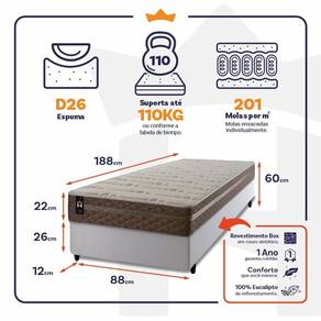 Medidas do Colchão: 88x188x22 cm, 96X203x22 cm, 128x188x22 cm,138x188x22 cm, 158x198x22 cm, 193x203x22 cm.