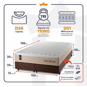 Feito com os mais nobres materiais em sua composição, ele conta com espuma D26 e molas ensacadas. Por ser mais macio, o colchão de molas ensacadas individualmente traz benefícios e ajuda no alinhamento da coluna. O colchão King House acomoda melhor o contorno do corpo, dispondo de forma correta quadris e ombros, expulsando as dores e problemas de coluna.