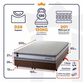 - Altura: 27 cm (colchão) + 26 cm (box) + 12 cm (pés) = 65 cm de altura;